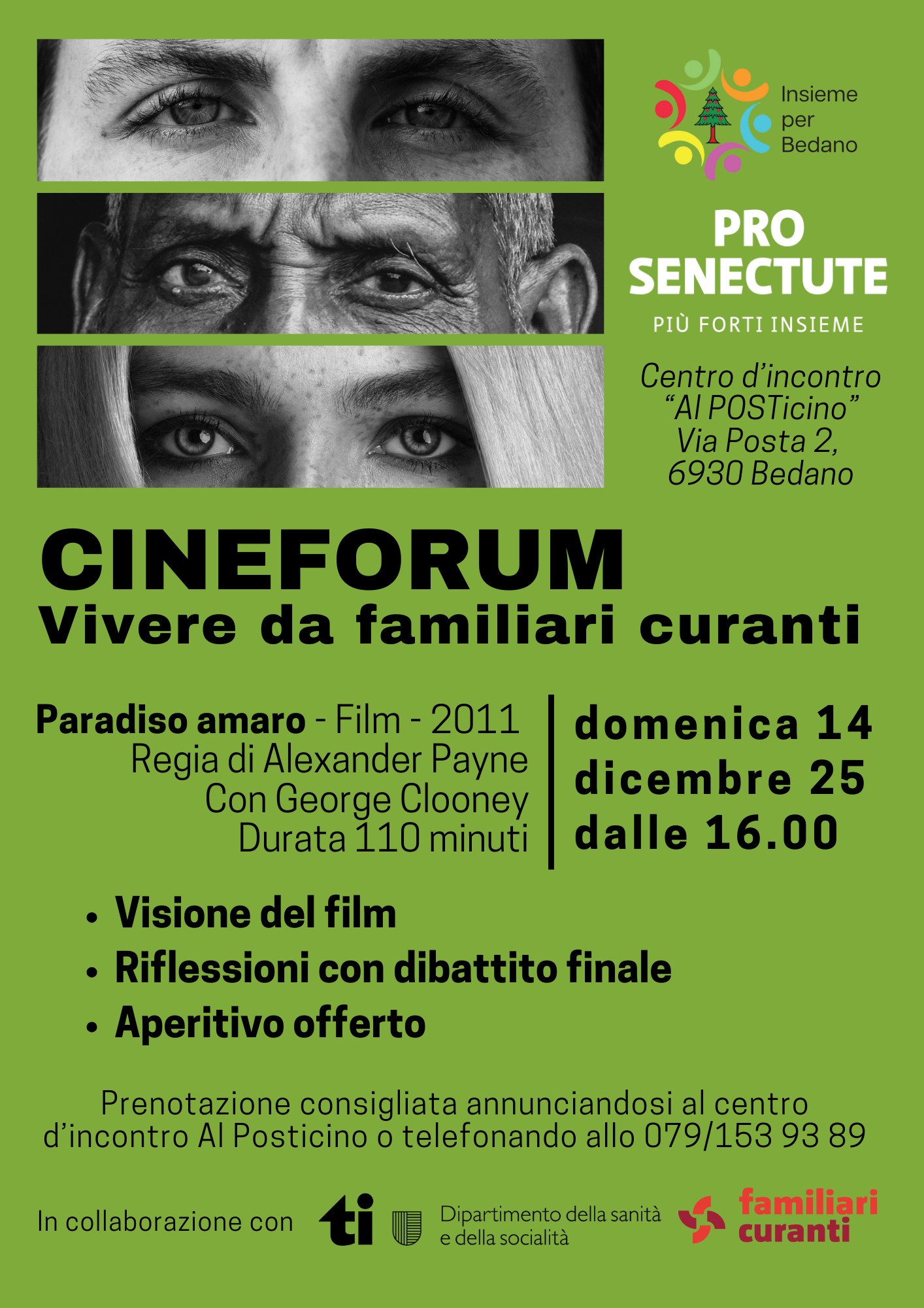 Per dare voce a chi vive questa esperienza, Pro Senectute Ticino e Moesano, in collaborazione con il Dipartimento della sanità e della socialità (DSS) e l’Associazione familiari curanti, organizza una serie di incontri sul territorio per creare momenti di ascolto, confronto e sostegno reciproco.